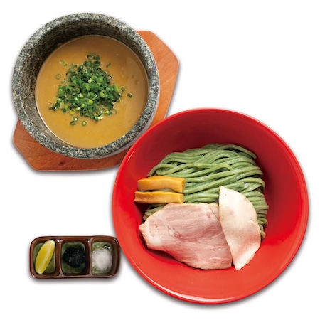 同店の提供するメニューのこだわりの一つは、国産素材を生かした「海苔麺」にある。国産小麦の極太麺に国産海苔を、麺が緑色になるくらいふんだんに練り込んだ特製麺で、すだちや岩塩、海苔醤油を添えることで、繊細な味の変化を楽しめる。