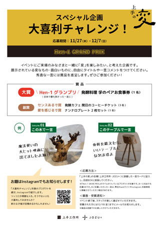 秀逸な一言には、ペアお食事券やオリジナル木製プレートなどの賞品をプレゼント。大賞のHen-1グランプリには「発酵料理 孚のペアお食事券」を1名に贈るほか、副賞としてセンスあるで賞 には「発酵カフェ閑日のコーヒーチケット」を3名に、愛を感じるで賞には「ナンナロプレート 2枚セット」を1名に贈る。愛のある一言を考えて応募してみよう。詳細は上手工作所公式HPでチェクしてみて。