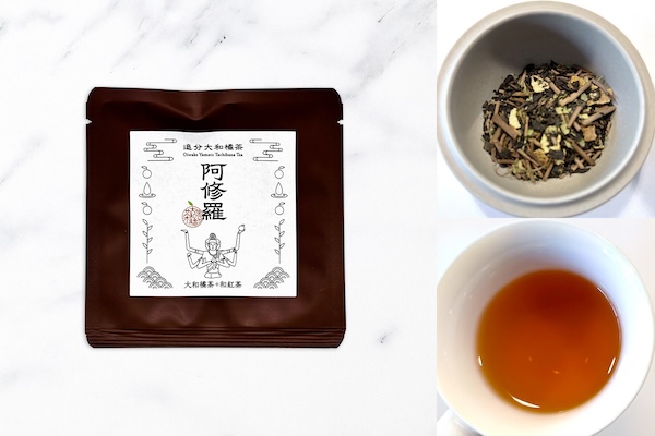 阿修羅(べにふうき)「特別なティータイム」は、国産・無農薬栽培の「べにふうき」を発酵させた和紅茶を贅沢に使用。「べにふうき」特有のバラのような優雅な香りと心地よい渋味が特徴で、大和橘茶の清涼感と絶妙にマッチする。
