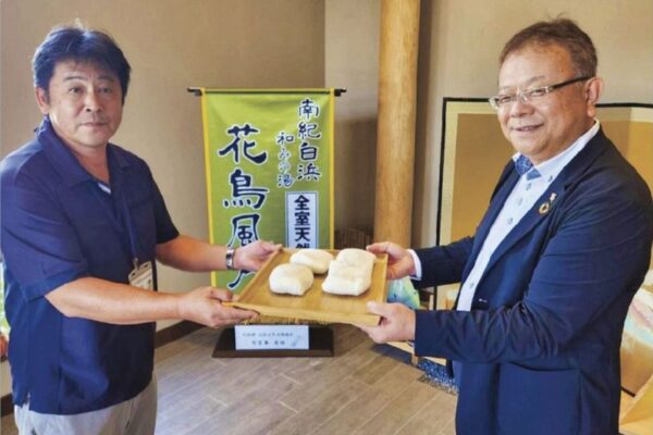 初回の提供時には、総支配人・石田勝己氏が、白浜町社会福祉協議会の松本隆志事務局長へ直接手渡しを行った。同取り組みに際して石田氏は、「いろんな事情を抱えている方がいらっしゃると思います。声を上げづらい方にも、『遠慮しないでいいよ』という気持ちが伝われば嬉しいです」と話している。