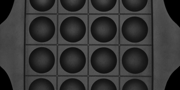 焼きムラが起こりやすい角の穴は、あえて鋳物の厚みを調整し、中心部から熱が届きにくい角部まで均一に熱が伝わるよう設計。どの穴もほぼ同じタイミングで焼き上がり、最後のひと玉まで、きれいなまんまるが並ぶ。