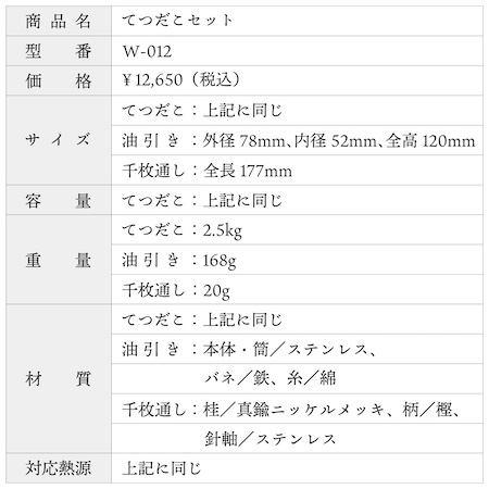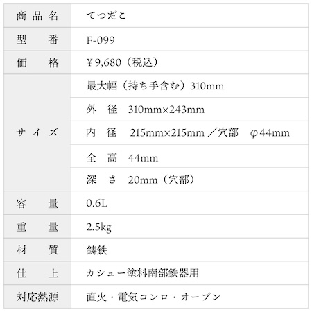 「てつだこ」の価格は9,680円(税込)。容量0.6L、重量2.5kgで、直火・電気コンロ・オーブンに対応している。