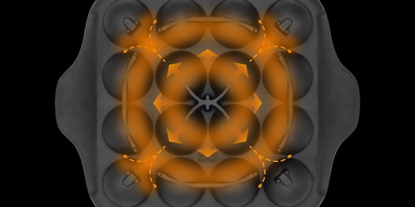 鋳鉄は火加減が難しいと思われがちだが、厚みのある鉄が蓄えた熱はぶれにくく、冷たい生地を入れても温度が落ちにくいため、細やかな火加減は不要。中火のまま一気に焼ける。直火の熱と輻射熱が外と中から均一に働き、素早く安定した焼き上がりを実現する。