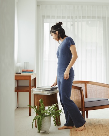 「腹巻フレンチスリーブトップス」8,250円(税込)は、取外し可能な胸パッドと、腹巻付きのフレンチスリーブトップスだ。首元はクルーネックの程よい開きで安心感があり、フレンチスリーブが気になる腕周りを目立たせない。腹巻き仕様はお腹周りももちろん温められ、ボトムスにインしてもすっきり着用できる。