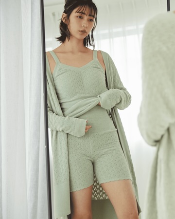 唯一無二の“透かし編み”をデザインに取り入れたニットランジェリーは、伸縮性に優れ、肌にやさしくフィットしながら、着るだけで気持ちよく自然と体を温めてくれる。