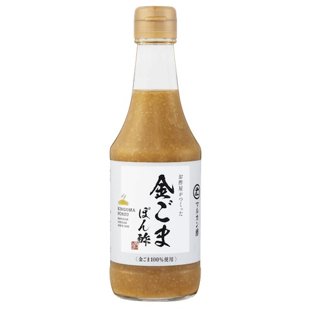 「金ごまぽん酢」は、濃厚な香りと深いコクが特徴の金ごまを、すりごま・ねりごまの2種類使用。醸造酢に加え、お酢屋ならではの「静置発酵の黒酢」で旨味を広げている。