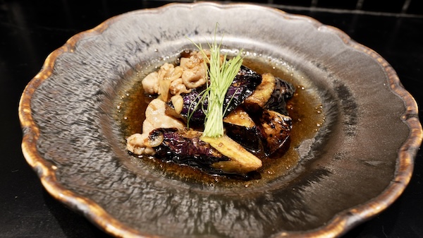 「黒酢茄子」980円は、とろける茄子と豚肉の旨みを、芳醇な黒酢が包み込む一品。まろやかでコク深い黒酢の酸味が、豚肉の甘みと茄子の濃厚さを引き立て、口の中いっぱいに広がる絶妙なハーモニーを生み出す。