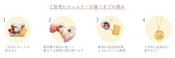 自宅にジュエリーが届くまでの流れは、まず自宅にキットが届き、説明書の指示に従って鼻または肉球の紋を採る。次に、ワックスを返送用封筒に入れポストに投函する。キットを用いて採取したペットの鼻紋がついたワックスを返送してから1〜2か月でネックレスやリングに仕立てて届けられる。
