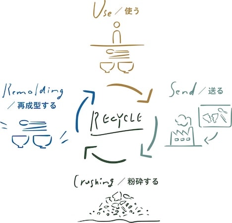 また地球に優しい素材を使用しており、木から生まれ、また巡るという、100%リサイクルできるサステナブルな食器。原料であるセルロースファイバー複合樹脂は、マテリアルリサイクルが可能な次世代型新素材だ。