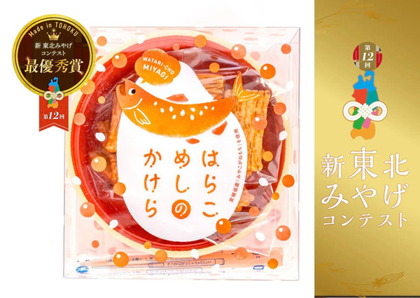 「はらこめしのかけら」は、宮城県亘理町の郷土料理「はらこめし」を模したあられで、宮城県産のもち米「みやこがねもち」を使った生地にサケを練り込み、イクラを漬け込んだしょうゆで味付けした商品。