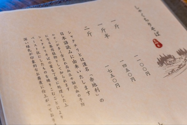 通が喜ぶ変わり蕎麦もある。“しゃくちり”──そばの葉を練りこんだ麺は、ふわっと青い香り。まるで森の中で深呼吸したような、澄んだ味わいだ。
