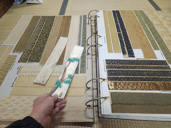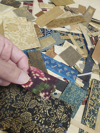 手に入れた古裂は、傷みを補修したうえで選びやすいように整理をしておく。いざという時、作品を裂地にあててみて相応しい裂地を選び出すのだ。会場では、昔の掛軸と今の掛軸を見比べられる。