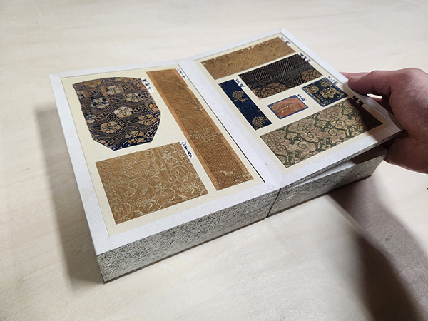 今回展示される「古裂帖(裂手鑑)」は、端裂を集めて貼りこんだアルバムのような折り帖のこと。