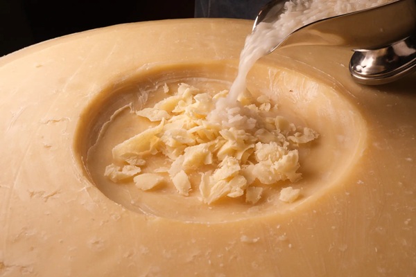 パルミジャーノチーズのリゾットは、熱々のパルミジャーノチーズリゾットを、五感で楽しめる商品。目の前で仕上げるライブ感と、北イタリア産チーズの豊かな香り、鉄板が奏でる音が食欲をそそる。風味豊かな濃厚なチーズリゾットを楽しんでみて。
