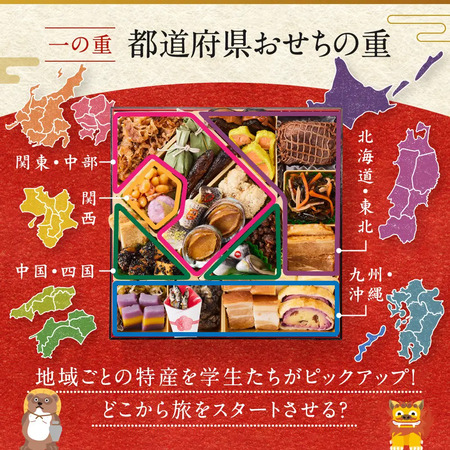 一の重は「都道府県おせちの重」として、北海道「十勝ハーブ牛のローストビーフ」「松前漬」、東北「山椒香るにしん巻」「さけの菊花巻」、中部「プレミア飛騨牛しぐれ」「あわび割烹煮」、関東「子宝煮」「コハダの粟漬け」、近畿「初春 桜餅」「柚子香るエビ豆煮」、中国「しじみ佃煮」「ままかり甘酢漬」、四国「ちいさなじゃこ天さん」、九州「きびなごの田作り」、沖縄「ラフテー」などが入っている。