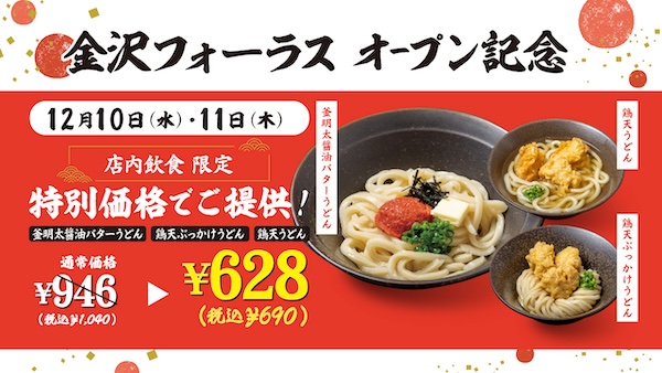 オープンを記念して、「山下本気うどん 金沢フォーラス」へ来店した人を対象にオープン記念キャンペーンを12月10日(水)と11日(木)の2日間限定で実施する。