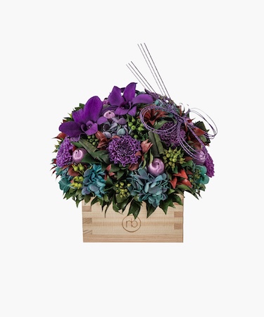 また、オリジナルの枡にアレンジしたプリザーブドフラワーアレンジメント「New Year Arrangement – Masu」49,500円(φ17.5×H16cm)は、煌めくパープルの水引と、グリーンからパープルへと移ろう花材が調和し、モダンで洗練された雰囲気。紫陽花やデンファレ、マムが織り成す落ち着いた色合いが、枡の木目と響き合い、水引を外せば季節を問わずインテリアアイテムとして使える。