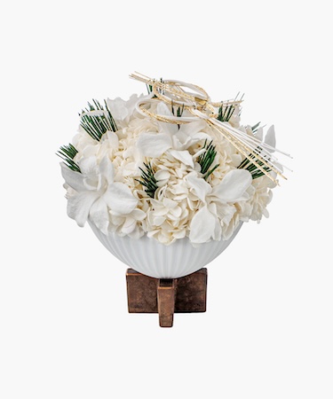 さらに、ニコライ バーグマンオリジナルの菊をモチーフにし、有田焼クリサンサマムベースにアレンジしたプリザーブドフラワーアレンジメント「New Year Arrangement – Arita」44,000円(φ15.5×H18cm)も登場。ホワイトの紫陽花やデンファレに松のグリーンが映え、ホワイトゴールドの水引が清らかな輝きを添え、お正月らしい表情に仕上げている。