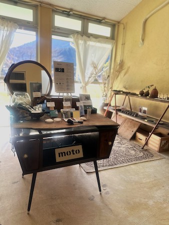 今回の移転に合わせ、「datte」内にショップ「もと」が新規オープンした。東栄町で採れる鉱物・セリサイトを使った化粧品ブランド「moto(モト)」の製品に加え、町の特産品や、町在住の陶芸作家・山本幸嗣氏の作品など、地域の魅力を伝える品々が並ぶ。観光客にも町民にも開かれた「東栄町の魅力を持ち帰れる店」を目指す。