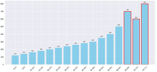 同エリアの年齢別棒グラフ(2020年国勢調査より)※縦軸:人数/横軸:年齢で、右端が75歳以上から順に5歳ずつ下がる
