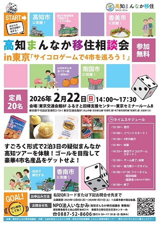 また、2026年2月22日(日)の14:00~17:30に東京交通会館にて、南国市と隣接する高知市、香美市、香南市とともに、「高知まんなか移住相談会」を開催する。当日は、2泊3日の疑似まんなか高知ツアーを体験することができるすごろくゲーム(賞品あり)を行うなど、高知の「まんなか」地域の魅力を伝える。
