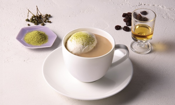 ラムレーズンの深いコクとぶどう山椒の香りで、五感に響く冬のご褒美ドリンクに仕上げている。トッピングの「ぶどう山椒」が少しずつ溶けていくため、香りや味わいの変化も楽しむことができる。