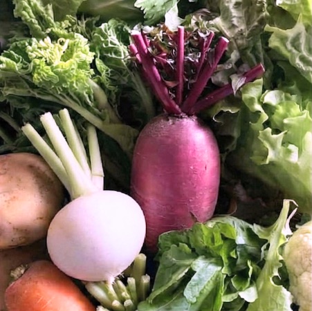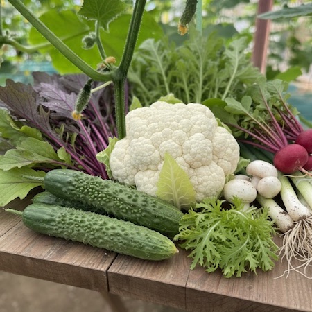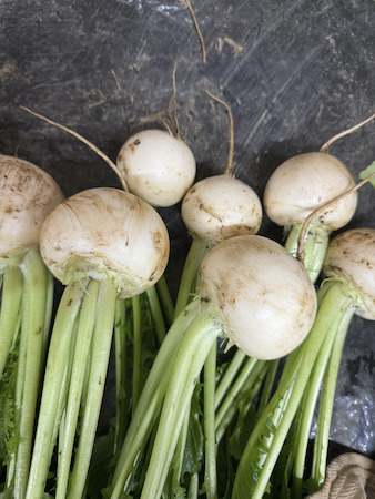 この時期の野菜の一部を紹介しよう。サラダ白カブは、カブ本来の香りとコクのある甘さで「これカブ?」と思う程の旨み。皮ごと食べられるのでサラダやバーニャカウダーにもおすすめ。繊維質が柔らかいので軽く火入れするとトロっとした食感に変わり、甘みが増す。品種リレーにより、1月いっぱいまで続く予定だ。栽培期間中、化学農薬・化学肥料不使用、自家製堆肥。