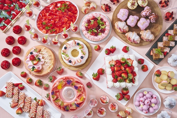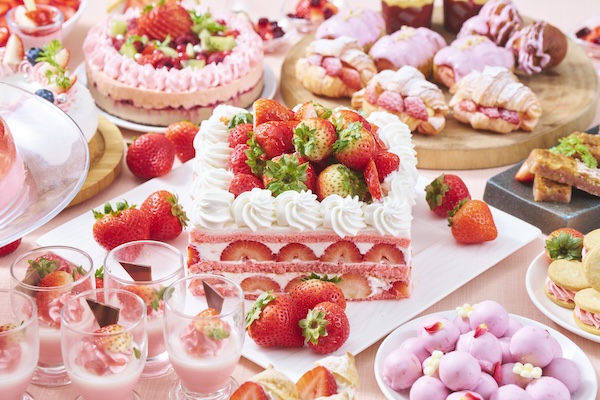 「ストロベリースイーツビュッフェ ~イチゴを堪能する4カ月~」では、月ごとのテーマに合わせた期間限定のイチゴスイーツとパンを各2種類ずつと、ホテル定番のイチゴスイーツ12種類を合わせた全16種類をビュッフェ形式で提供する。