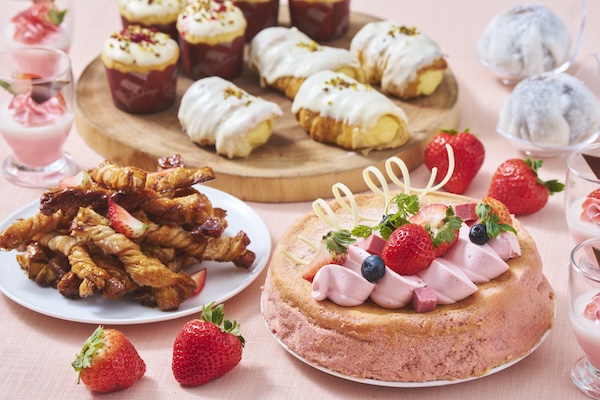 イチゴの香り、甘さ、酸味を丁寧に引き出したイチゴスイーツ7種類、パンにはストロベリースコーンやストロベリーデニッシュ2種類に加え、サーモンのミキュイ、ローストビーフのクロケッタ、イチゴとフレッシュチーズのサラダの3種類のセイボリーが用意されている。