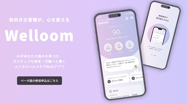 長野県富士見町に本社を構えるピノビスタは、AI×ポジティブ認知行動療法によるメンタルヘルスケアアプリ「Welloom」のベータ版をリリース。公式サイトより無料で利用可能だ。
