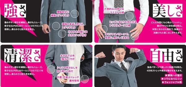 三つ目の特徴として、高耐・実用機能がある。抗菌・防臭、洗濯可能、摩耗や型崩れに強い構造など“働く服”としての強さを追求している。