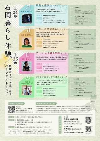 「石岡暮らし体験」のコンセプトは、「石岡市内のキーパーソン、先輩移住者との交流を通して石岡市の魅力を知る」。今回の体験では、石岡市の「暮らし・なりわい」に焦点をあて、先輩移住者のもとを訪れる4つのコースを設けている。