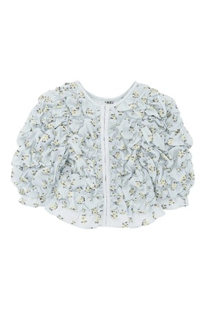 「MINAMI TANAKA×CLANE W FACE FLOWER JACQUARD SHIRRING TOPS」22,000円(税抜)は、CLANEで人気のシャーリングディティールを贅沢に取り入れ、ギャザーを多めに寄せることで、花柄の魅力がより際立つ立体的な表情に。身頃はすっきりとまとめ、袖には程よいボリュームをもたせたパフスリーブを採用。フロントはホック仕様で、トップスとしても、軽い羽織りとしても活躍する。