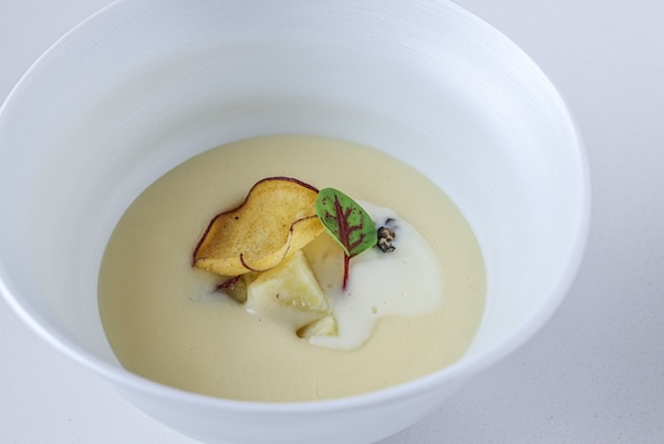 Soupe [甘味]は、サツマイモ3つのテクスチャー、マスカルポーネクリームと東京蜂蜜、カンポットペッパーのアクセント、