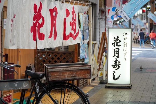 布施駅北側、ブランドーリのアーケードを歩くと、不意に視界の隅に赤い文字が灯る。白地の暖簾に染め抜かれた「花月寿司」の文字。そして横には、年季の入った出前自転車。のれんの向こうから聞こえてくる「へいっ!いらっしゃい!」の声が、通りの空気を少しだけやわらかくする。
