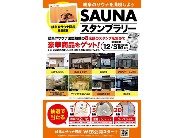 このスタンプラリーは、岐阜の魅力を発信するフリーペーパー『岐阜美少女図鑑』とのコラボレーションで誕生した「岐阜#サウナ図鑑」掲載施設を対象とし、地域の温浴文化を広めて活性化に貢献することを目指している。参加者は8施設のスタンプを集めることで、JTB旅行券などの賞品が抽選で当たるチャンスがある。