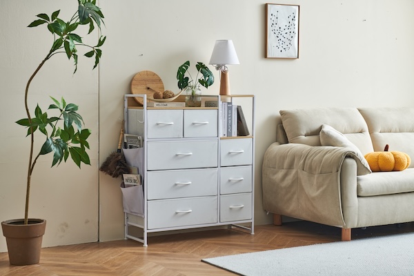収納力とデザイン性を両立させ、生活空間に馴染むシンプルなホワイトカラーを採用。チェストとしてだけでなく、サイドテーブルとしても使えるので、日常のあらゆる場面で活躍する。