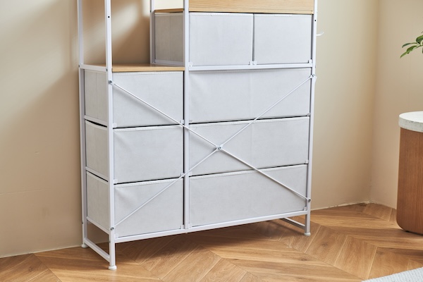 厚さ12mmの高品質木板を使用した「チェスト」は、傷や汚れに強く、長期間の使用でも変形しにくい設計。重い衣類や小物も安心して収納可能で、耐荷重もしっかりと確保されている。