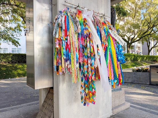 「むすび」の材料には、世界中から広島の平和記念公園に送られてくる、折り鶴を再生した紙を使っている。