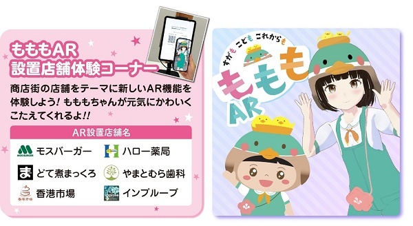 駅前で開催される今回の「ももも誕生祭2」では、商店街内6つの協力店舗を再現した「もももAR設置店舗体験コーナー」で、自分のスマホに「もももちゃん」が出現。さらに強化された「もももAI」を、対話を通じて体験してみよう。