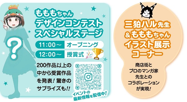 また、「もももちゃんデザインコンテスト」では、スペシャルステージにて、「もももちゃん」の新ビジュアルを大公開。商店街の子どもたちが応募した200点を超えるイラストの中から、受賞作品がステージ上で発表される。さらに、KADOKAWAコミックス連載作家の三狛ハル氏が、最優秀デザインをイラスト化して発表するという。