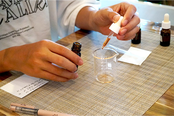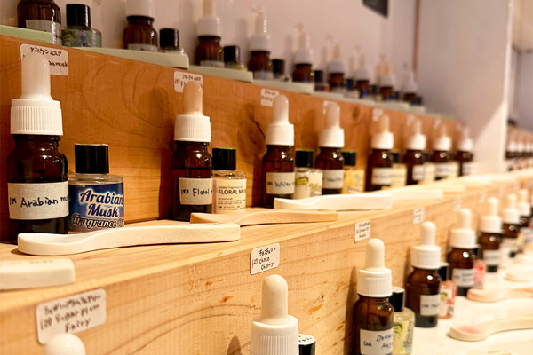 名古屋でも珍しい“香り作り専門店”で、100種類以上がラインアップするフレグランスオイルから選んで、“香りを作る”体験を行っている。香りの選び方から調香、ギフト仕上げまで、スタッフのサポートを受けながら、世界にひとつの香りを仕上げていく。