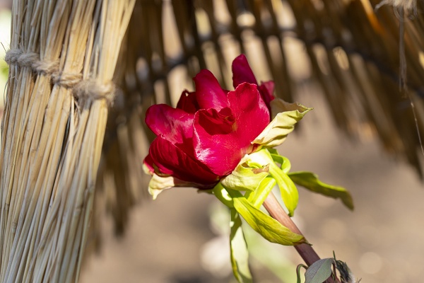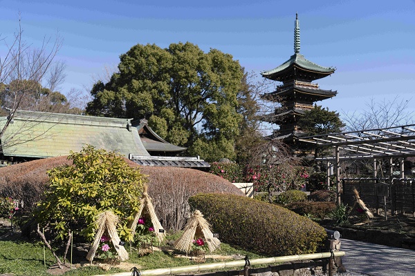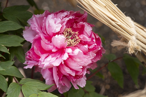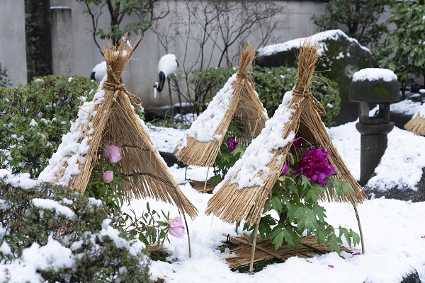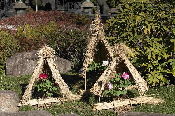 “わらぼっち”は、地域によって形や結び方等が様々。「上野・東照宮 冬ぼたん」では、開苑当時から荒縄を用いた男結びや、