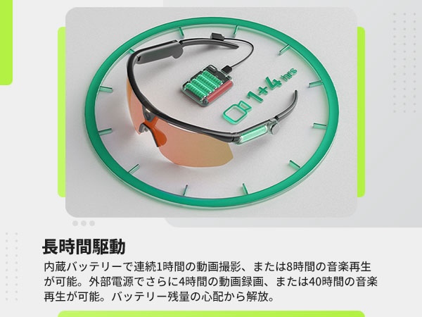 ストレージは32GBのローカルストレージを搭載。バッテリーは260mAhで、連続使用時間は8時間(音楽/通話)。録画時間は60分〜最大300分(BleeqUp Power Plus使用時)だ。重量は49gで、防水・防塵はIP54等級。オーディオは4スピーカー、5マイクアレイ、通信はリアルタイムインターコムに対応し、レンズはUV400保護で交換可能となっている。