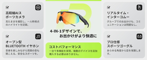 BleeqUp Rangerは、「サングラスにカメラ・イヤホン・トランシーバーを全部まとめたい」というユーザーの声から誕生した、まったく新しい次世代の4-in-1スポーツグラス。