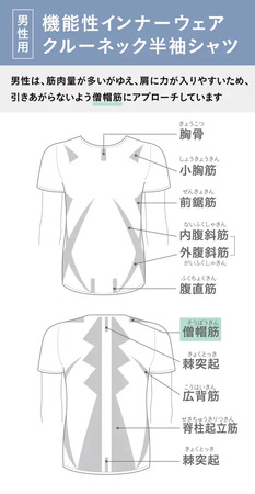 また、男性は筋肉量が多く、無意識に肩に力が入りやすいため、これが身体のゆがみの一因になるのだそう。そこで、僧帽筋をサポートすることで、力を抜くよう働きかけ、本来の正しい姿勢へ導くとのことだ。吸汗速乾、抗菌防臭機能も付いている。