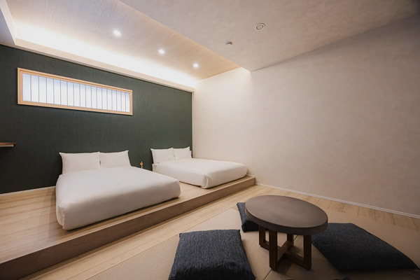 2階は「やすらぎ」の場である、旅の疲れを包み込む和室寝室。落ち着いた和室の寝室は、旅の疲れをそっと包み込むような、やさしい光に満ちており、和の落ち着きと、北欧デザインの機能美が融合した、心身ともにリラックスできる空間だ。
