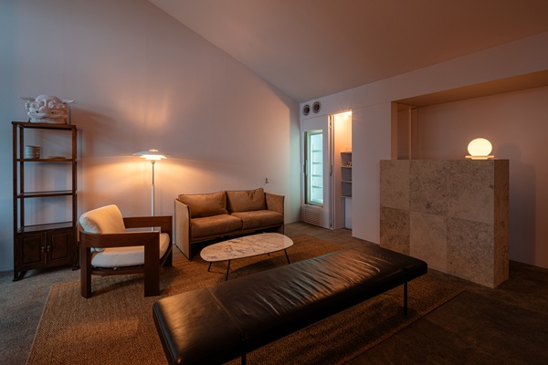 館内は、狗留孫山の自然と心を映した空間デザイン。狗留孫山の静寂と力強さを象徴する天然石を使ったテーブル、狗留孫山に自生する杉を想起させる杉皮を使用した屏風などが配されている。