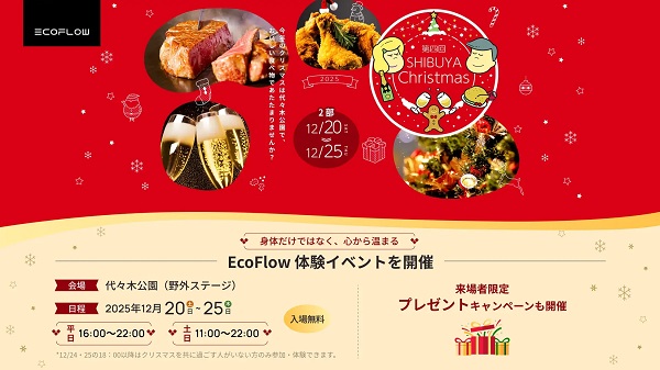 ポータブル電源とクリーンエネルギー技術のリーディングカンパニー・EcoFlow Technology Japanが、12月12日(金)~25日(木)の期間、渋谷区の代々木公園で開催される「第四回 ふるさと東京応援祭 in SHIBUYA Christmas」に電力供給をサポート。