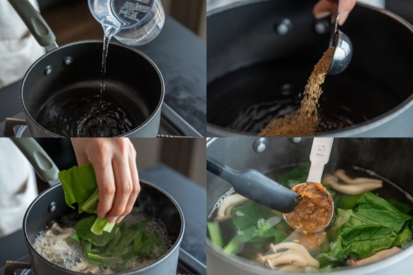 調理時間は10分。材料は2人前の場合、卵2個に小松菜50g、しめじ50g、水400ml、「信州白樺印みそ オリジナル・緑」大さじ2、顆粒和風だしが小さじ2分の1。